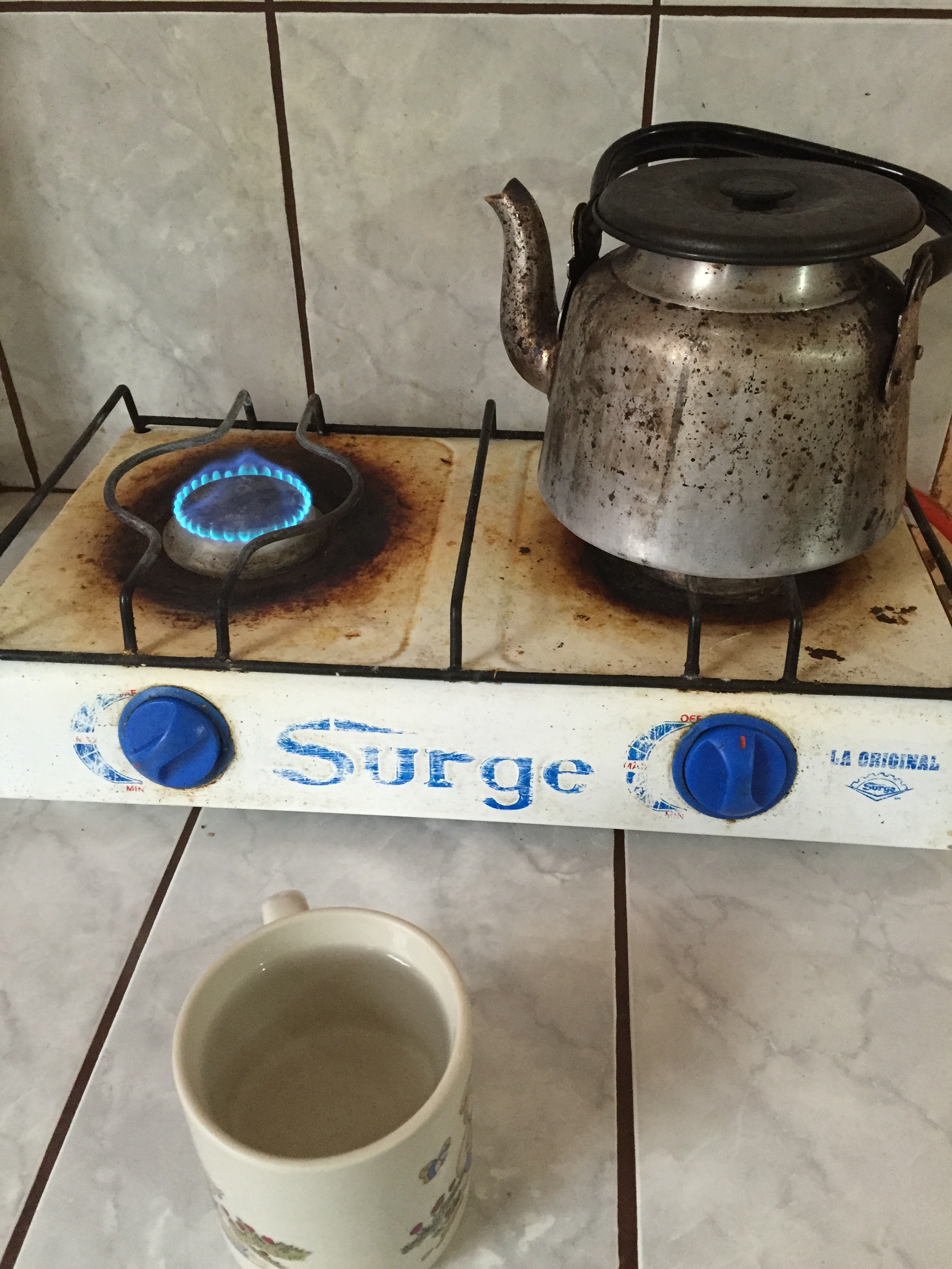I filled the kettle with water, gas on and cup ready. Once the water boils i pour water it into the cup and then sit and warm my hands up, this is my only form of heat.